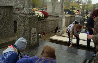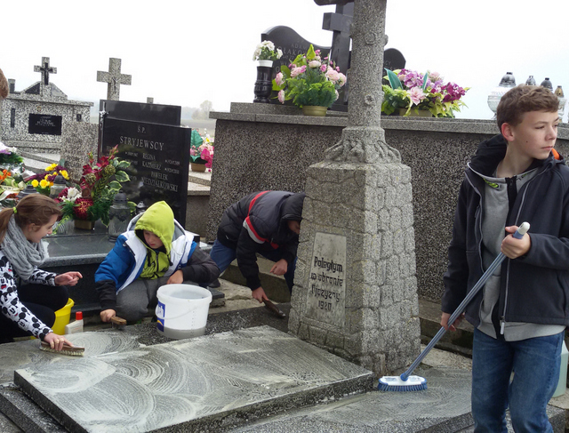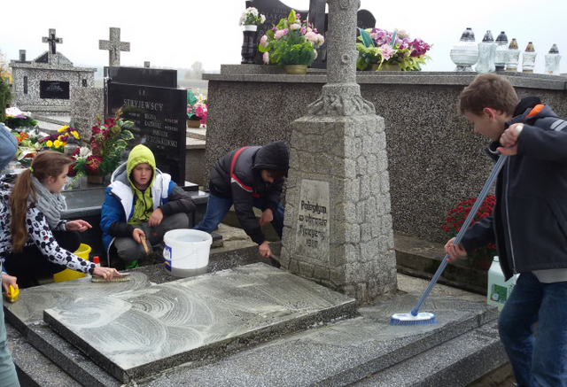 To szczególne miejsce jest symbolem naszej pamięci, którą od wielu lat pod opieką p.Urszuli Derbin pielęgnują uczniowie naszej szkoły. Uporządkowali oni płytę nagrobkową, złożyli biało-czerwone chryzantemy i zapalili znicze. Chwilą ciszy i zadumy oddalali im należną cześć. Dojazd na cmentarz i powrót do szkoły zawdzięczamy rodzicom naszych uczniów, za co im z wdzięcznością dziękujemy.
