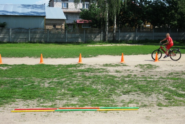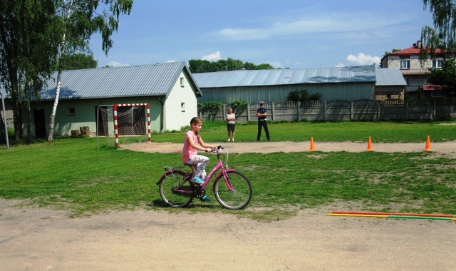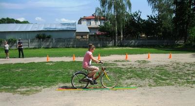 Do egzaminu praktycznego uczniowie przystąpili po otrzymaniu pozytywnej oceny z części teoretycznej. 30 maja na specjalnie przygotowanym ,,torze”, w obecności dwojga policjantów, sprawdzono następujące umiejętności: jazdę na rowerze, poruszanie się po wyznaczonym pasie ruchu, zatrzymywanie się we wskazanym miejscu, prawidłowe przygotowanie do jazdy oraz właściwe włączanie się do ruchu.
