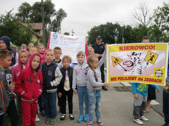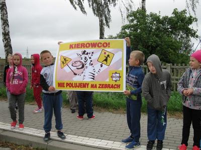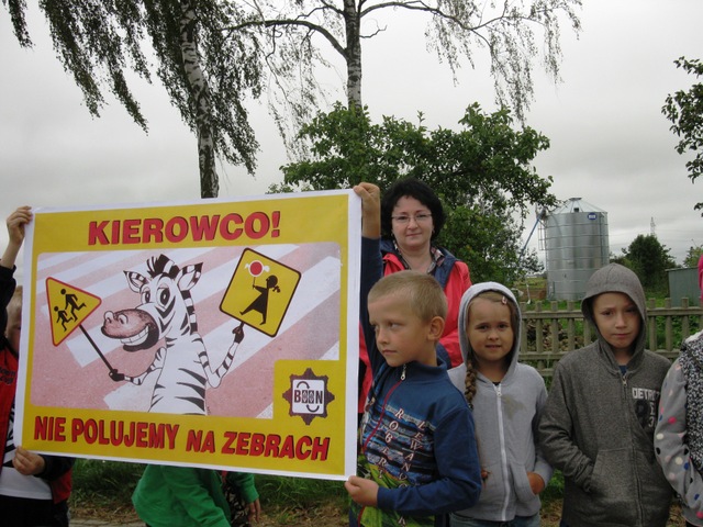 Przedsięwzięcie realizowane było w pobliżu przejścia dla pieszych, oznaczonego znakiem T – 27 ,,Agatka”. W ramach akcji, dzieci prezentowały plakaty ,,Kierowco! Nie polujemy na ZEBRACH”. Zachęcały kierowców do zachowania szczególnej ostrożności, zbliżając się do przejścia dla pieszych oraz postawy kulturalnego partnera na drodze.