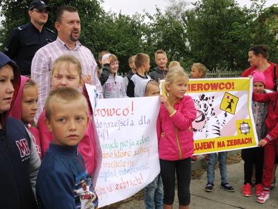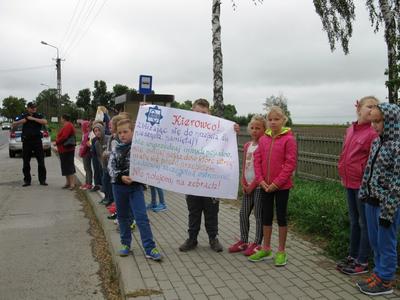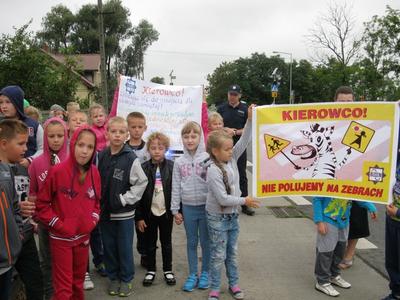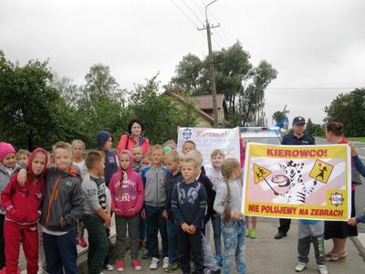 5 września 2016r. w godz. 9:30 – 10:00 uczniowie kl. I – III wraz z wychowawczyniami: p. I. Łączyńską, p. B. Blados, p. B. Goździewską w obecności policjantów z pionu Ruchu Drogowego, uczestniczyli w happeningu, dotyczącym kampanii profilaktycznej pod nazwą ,,Kierowco! Nie polujemy na ZEBRACH”.