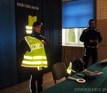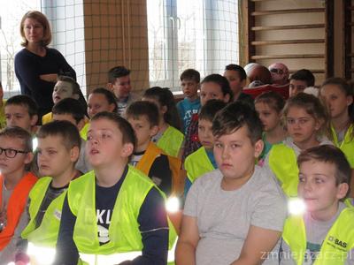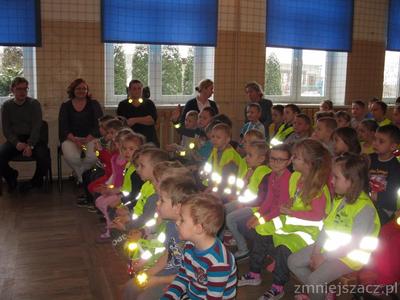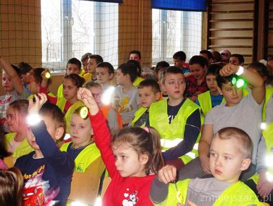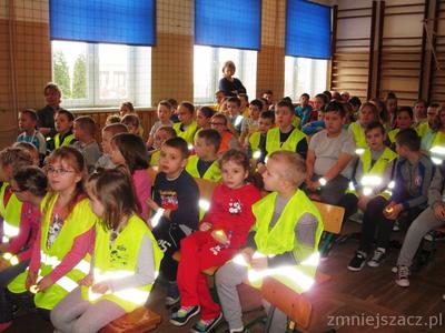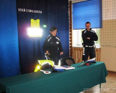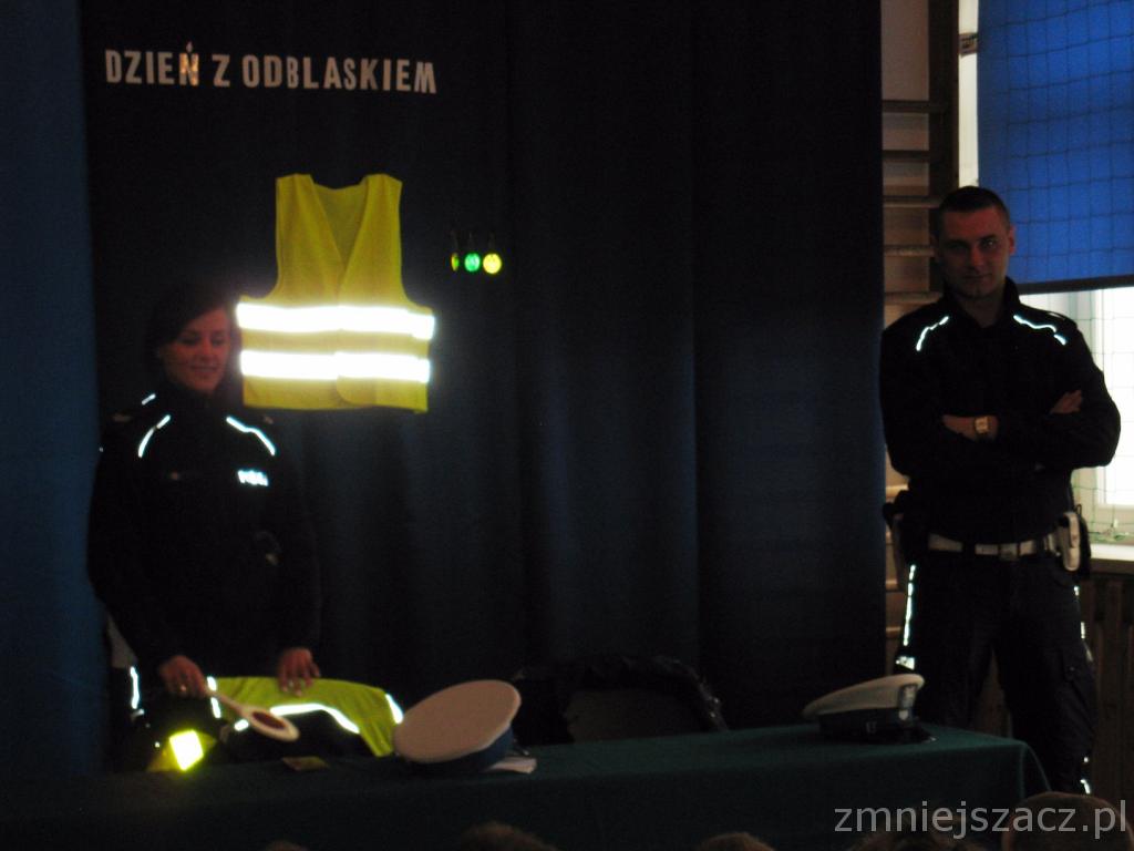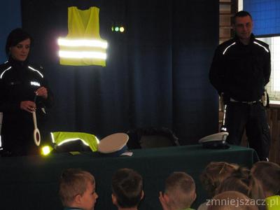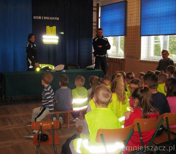 Naszą szkołę odwiedziło dwoje policjantów z Wydziału Ruchu Drogowego Komendy Powiatowej Policji w Ciechanowie. Przedszkolaki oraz uczniowie kl. I–VI, wyposażeni w elementy odblaskowe zgromadzili się na sali gimnastycznej, by wziąć udział w pogadance na temat konieczności noszenia odblasków.