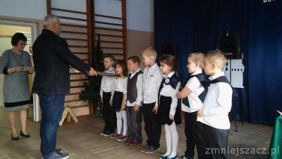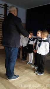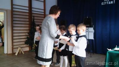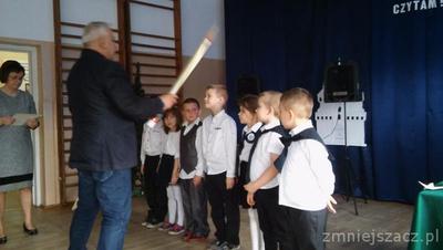 Potem odbyło się pasowanie na czytelnika, którego dokonał dyrektor szkoły p. Henryk Chojnacki. Na pamiątkę pełnoprawni czytelnicy biblioteki otrzymali dyplomy, zakładki do książek oraz słodycze. Uczniowie klasy I obiecali, że będą kochać i szanować książki, korzystać z ich mądrości i sumiennie wypełniać obowiązki czytelnika. Pani Anna Redwanowska podziękowała wych. kl I p. Izabelli Łączyńskiej za to że propaguje czytelnictwo wśród swoich wychowanków.