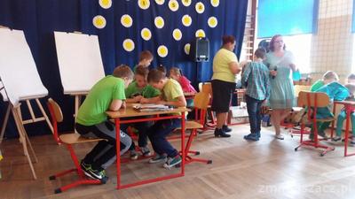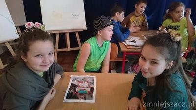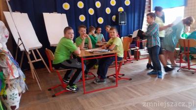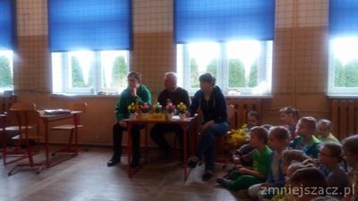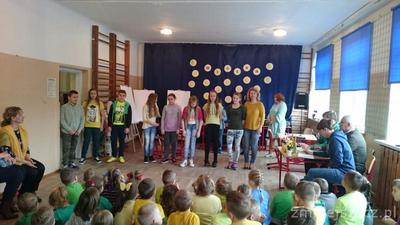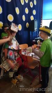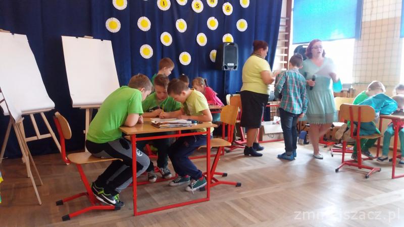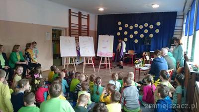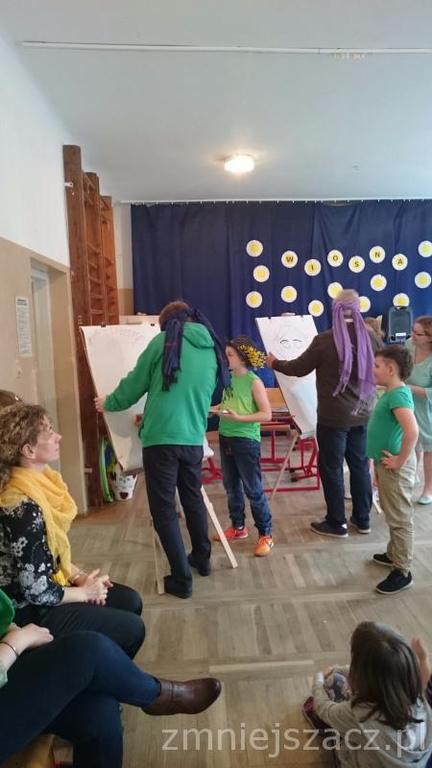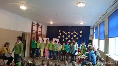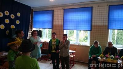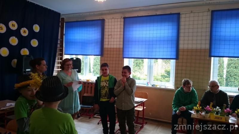 Dnia 21 marca w naszej szkole odbył się Pierwszy Dzień Wiosny. W tym dniu wszystkie dzieci przyszły do szkoły bez plecaków. Ten dzień był wolny od zajęć szkolnych. Hurra!!! Dzieci oraz nauczyciele byli ubrani w kolorach żółtym i zielonym. Cała sala gimnastyczna wyglądała niezwykle kolorowo i wiosennie. Nauczyciele p. I. Łączyńska oraz p. M. Pokropska przygotowały bardzo dużo atrakcji i konkursów, gdzie można było wygrać nagrodę dla klasy. Niektóre konkursy to: układanie krzyżówki oraz puzzli w określonym czasie, zjedzenie cytryny i obdarzenie jury szczerym uśmiechem, ubranie jednej osoby w strój z gazet i wiele innych. Nie zapomniano również o nauczycielach – ich zadanie polegało na namalowaniu swojego portretu z zawiązanymi oczami oraz nauczyciel miał za zadanie obrać ziemniaka plastikowym nożem w roboczych rękawiczkach. Swój portret namalował również pan dyrektor. Pierwsze miejsca zostały zdobyte przez klasy, które miały największą liczbę punktów. Były to klasy:
