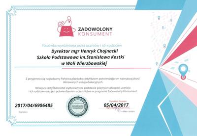Dyrektor szkoły Henryk Chojnacki i Rada Pedagogiczna serdecznie dziękują wszystkim rodzicom i uczniom, którzy oddali swoje głosy w sprawie pozytywnej opinii w programie Zadowolony Konsument. Dzięki Waszym głosom nasza placówka została wyróżniona certyfikatem potwierdzającym najwyższą jakość oferowanych usług edukacyjnych.