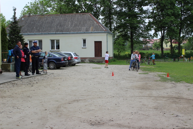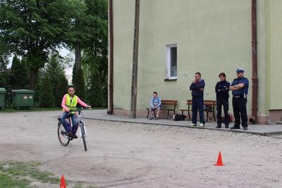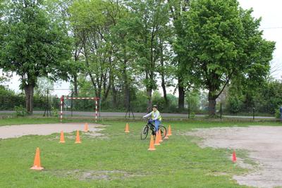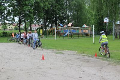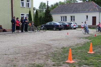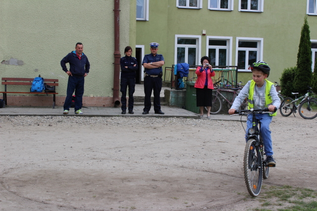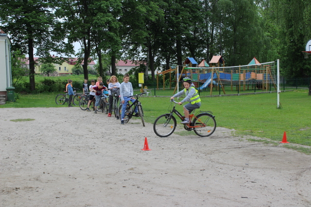 Do egzaminu praktycznego uczniowie przystąpili po otrzymaniu pozytywnej oceny z części teoretycznej. 24 maja na specjalnie przygotowanym ,,torze”, w obecności dwojga policjantów, sprawdzono następujące umiejętności: jazdę na rowerze, poruszanie się po wyznaczonym pasie ruchu, zatrzymywanie się we wskazanym miejscu, prawidłowe przygotowanie do jazdy oraz właściwe włączanie się do ruchu.