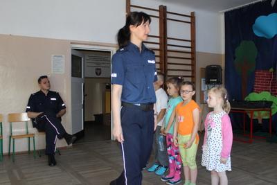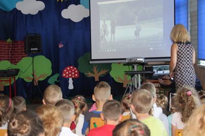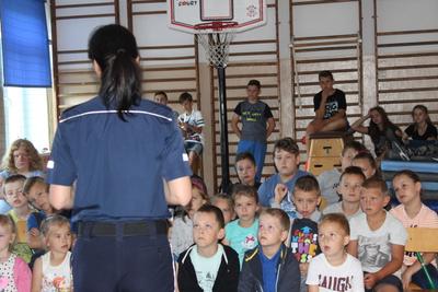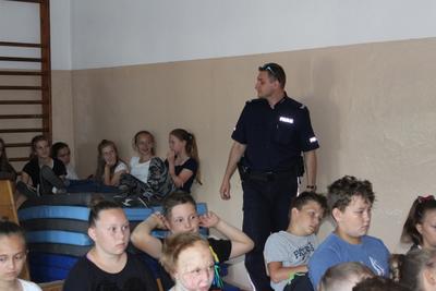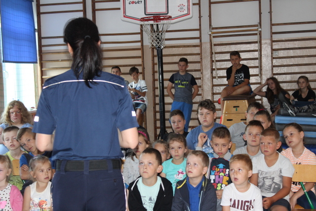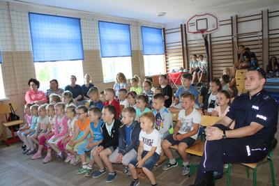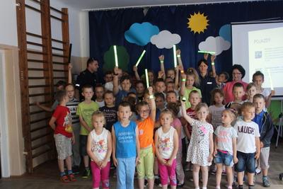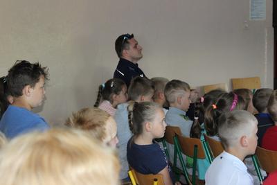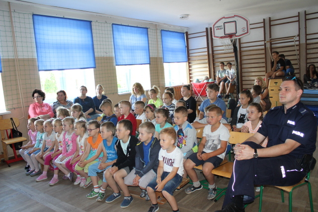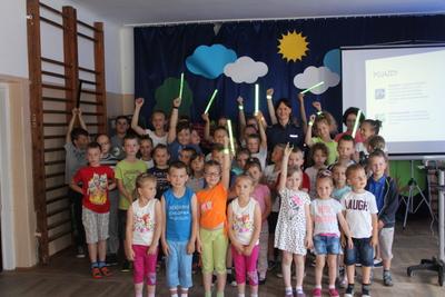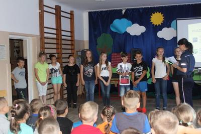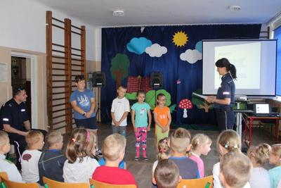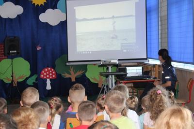 Uczniowie obejrzeli film o bezpiecznym zachowaniu nad wodą oraz prezentację na temat obowiązkowego wyposażenia rowerów. Dzieci z uwagą wysłuchały rad udzielanych przez policjantów. Następnie wzięły udział w quizie. Za poprawną odpowiedź, każdy uczestnik otrzymał nagrodę w postaci opaski odblaskowej.