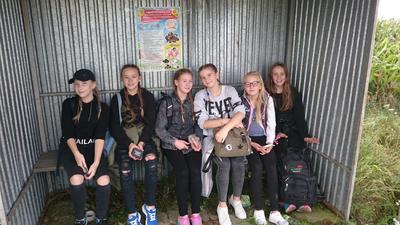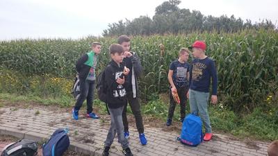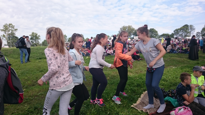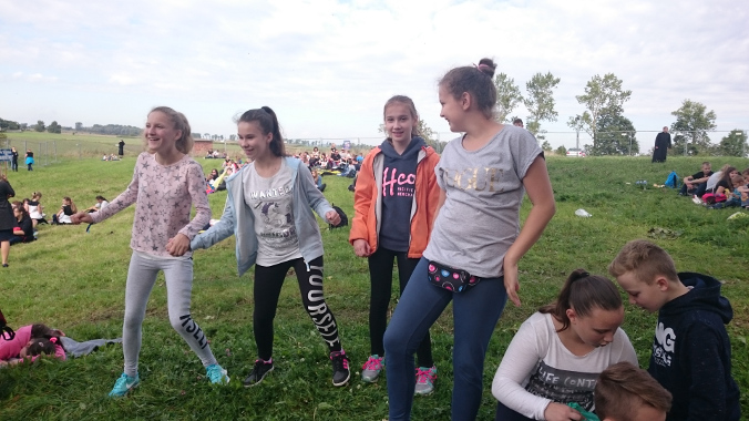 Pokonaliśmy drogę ze szkoły do Rostkowa w iście zawrotnym tempie. Zawdzięczamy to energii Krzysia I Pawła. Trudno było na nimi nadążyć. Klasa VII umilała nam marsz skocznymi piosenkami, nie były one religijne, ale za to niezwykle radosne. Absolutnym wyczuciem chwili popisali się Wiktor i Rafał, którzy podczas wchodzenia na ulice Rostkowa najgłośniej śpiewali piosenki o Stasiu Kostce, wzbudzając ogólną radość mieszkańców i mijających nas księży.