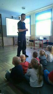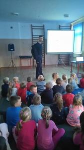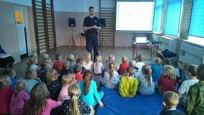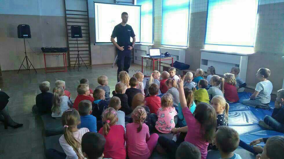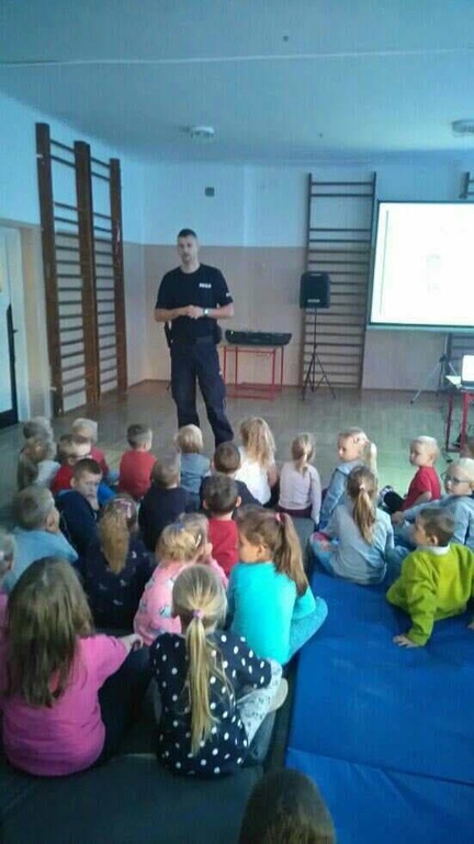 W ramach edukacji w tym kierunku 26.09.2018r zaprosiliśmy pana policjanta, dzielnicowego naszej gminy Opinogóra Górna, który spotkał się z dziećmi. Temat prelekcji dotyczył: ,,Bezpiecznej drogi do szkoły". Pan policjant omówił zasady zachowania bezpieczeństwa w czasie drogi do szkoły, a następnie uczniowie obejrzeli film pt:,, Bezpieczne zachowania". Film prezentował przestrogi dla dzieci, jak się zachować w różnych sytuacjach, gdy zaczepi nas na przykład obca osoba lub kiedy użyć numeru alarmowego. Dzieci czynnie uczestniczyły w spotkaniu, dzieliły się swoimi spostrzeżeniami i doświadczeniami oraz zadawały bardzo dużo pytań. Dzięki takim spotkaniom policjant będzie kojarzył się dzieciom, jako osoba, której nie należy się bać i do której zawsze i w każdej sytuacji można zwrócić się o pomoc.