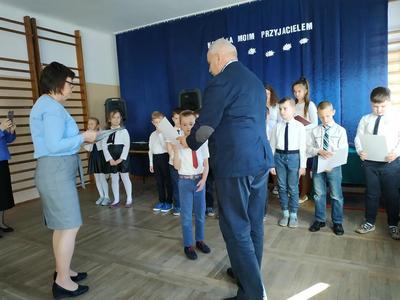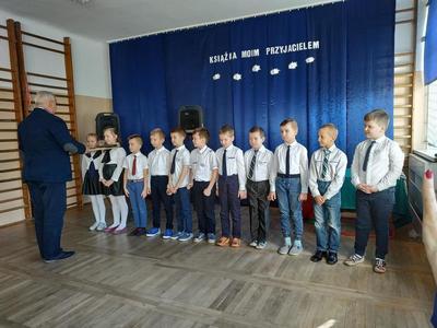 Następnie uczniowie kl. I złożyli akt przyrzeczenia, w którym to obiecali być wiernymi przyjaciółmi książek, dbać o nie, szanować je i czytać jak najwięcej. Potem odbyło się pasowanie na czytelnika, którego dokonał dyrektor szkoły p. Henryk Chojnacki.