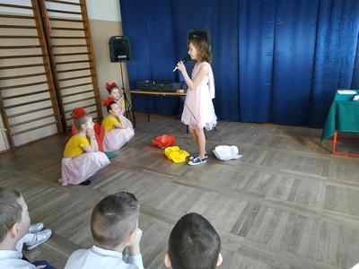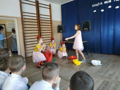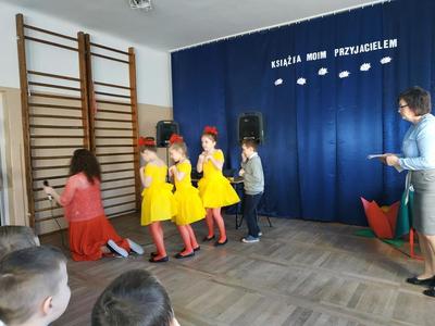 Zanim jednak uczniowie złożyli przyrzeczenie obejrzeli przedstawienie przygotowane przez uczniów kl. VI, jednego ucznia z kl. I – Dominika Benkie i trzech dziewczynek z kl. II. Zgromadzeni na sali gimnastycznej mieli okazję zaznajomić się z życiem i twórczością H. Ch. Andersena oraz zobaczyć fragmenty baśni napisane przez baśniopisarza, tj.: „Brzydkie kaczątko”, „Dziewczynkę z zapałkami” i „Calineczkę”.