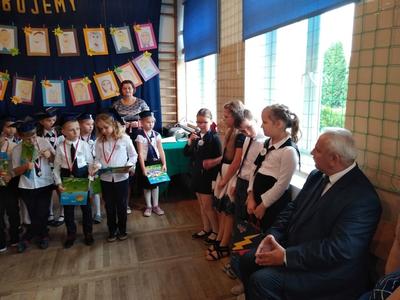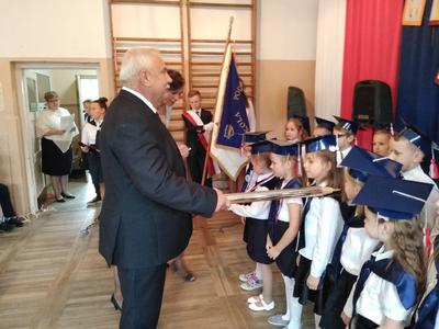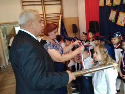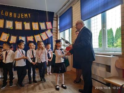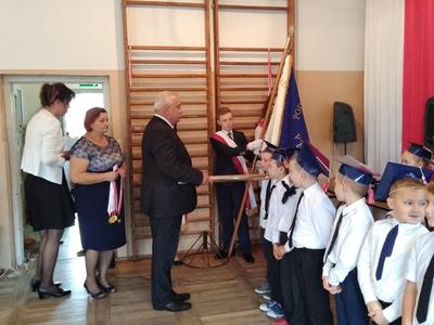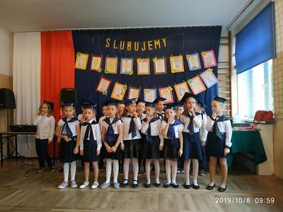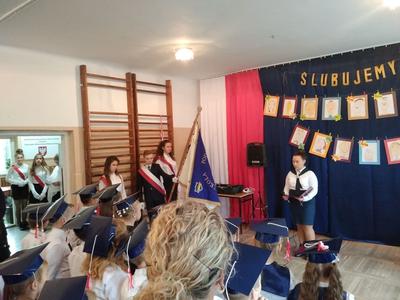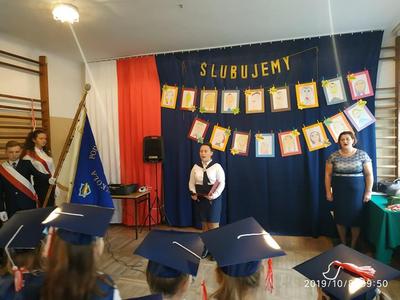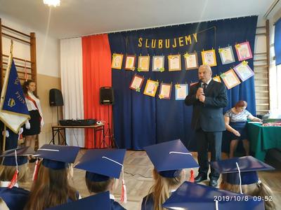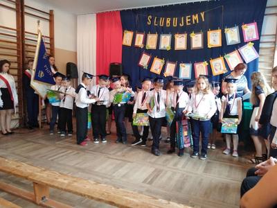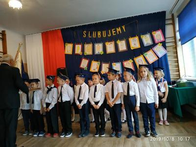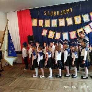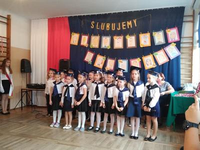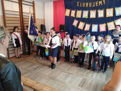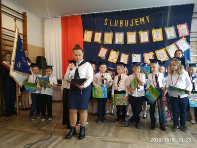 Po części artystycznej uczniowie klasy I z honorem złożyli ślubowanie na sztandar, a dyrektor szkoły pan Henryk Chojnacki dokonał uroczystego pasowania dzieci na uczniów. Uczniowie na pamiątkę tego wydarzenia otrzymali dyplomy, medale pasowania i tarcze szkolne ufundowane przez szkołę oraz upominek od klasy II i III.