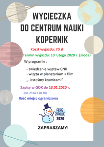 Wycieczka do Centrum Nauki Kopernik Galeria zdjęć Powiązane wiadomości Magia Świąt Szanowni Nauczyciele, drodzy Rodzice, Koleżanki... Szanowne Koleżanki i Koledzy! Wycieczka do Centrum Nauki Kopernik Szanowni Państwo, Koleżanki i Koledzy! Nagrody rozdane Drukuj Udostępnij Data dodania: 08.01.2020 Wyświetlono: 498 Aktualności