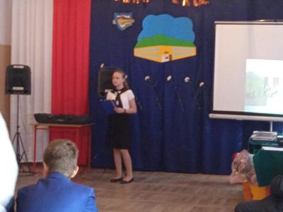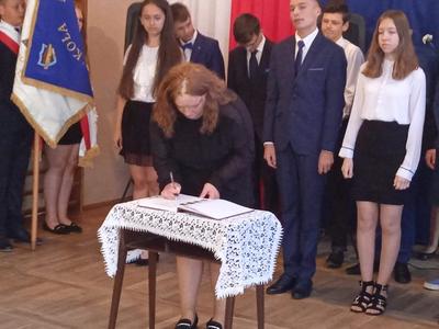 Część oficjalna uroczystości rozpoczęła się od wprowadzenia na salę gimnastyczną sztandaru i odśpiewania hymnu szkolnego.