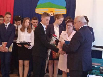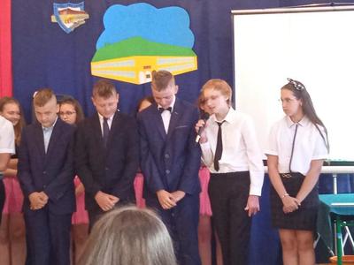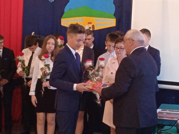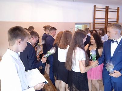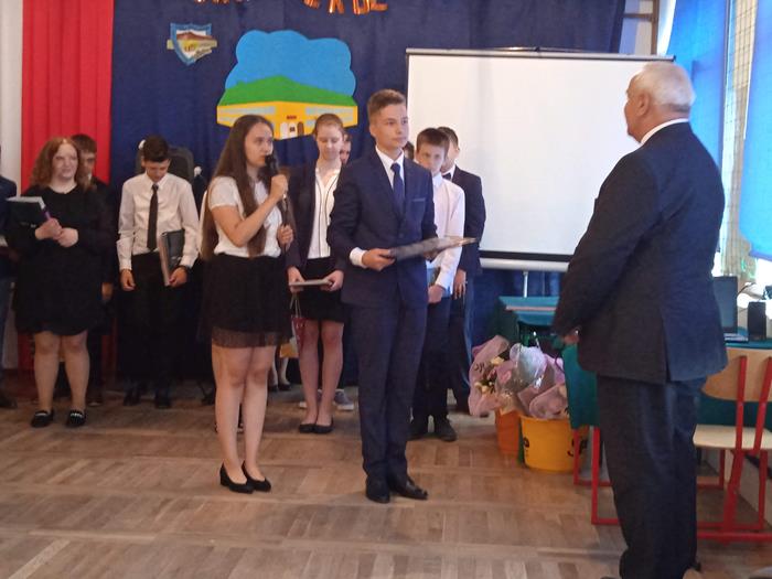 Nadszedł ważny moment uroczystości – absolwenci otrzymali świadectwa i dyplomy absolwentów., w tym sześcioro uczniów otrzymało świadectwa z wyróżnieniem i nagrody książkowe. Następnie zabrał głos pan dyrektor. Życzył uczniom kl. VIII, aby w należyty sposób wykorzystali zdobyte doświadczenie i wiedzę w szkole ponadpodstawowej.