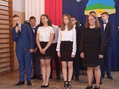 Po części oficjalnej poczet sztandarowy został wyprowadzony. Nastąpiła część artystyczna przygotowana przez uczniów kl. VIII pod kierunkiem p. Anny Redwanowskiej. Odżyły wspomnienia, przywołano pierwszych nauczycieli, p. Beatę Okoniecką i p. Izabellę Łączyńską. Uczniowie dziękowali nauczycielom za trud włożony w ich edukację, za zrozumienie, cierpliwość i mobilizowanie do nauki.