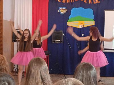Absolwentów pożegnali uczniowie kl. VII dedykując ciepłe życzenia. Cztery dziewczynki zaprezentowały układ choreograficzny.