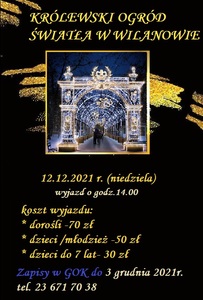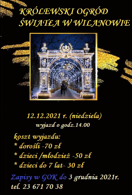 Gminny Ośrodek Kultury w Opinogórze Górnej serdecznie zaprasza do skorzystania z wyjazdu do Królewskiego Ogrodu Światła w Wilanowie, który odbędzie się dnia 12 grudnia 2021 r.