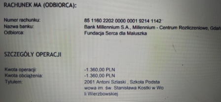 Społeczność szkolna ze Szkoły Podstawowej im. św. Stanisława Kostki w Woli Wierzbowskiej przyłączyła się w grudniu do akcji charytatywnej ,,To serduszko nie może się zatrzymać” dla Antosia Szlaskiego. Zbierane zostały korki jak również pieniądze, które w kwocie 1360,00 zł zostały wpłacone na konto Fundacji Serca dla Maluszka na szczytny cel pomocy małemu Antosiowi. Wyrazy podziękowania należą się wszystkim, którzy brali udział w szlachetnej akcji pomocy chłopcu.