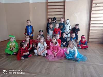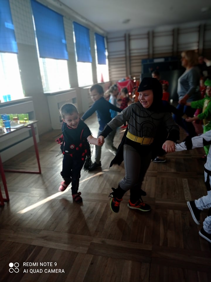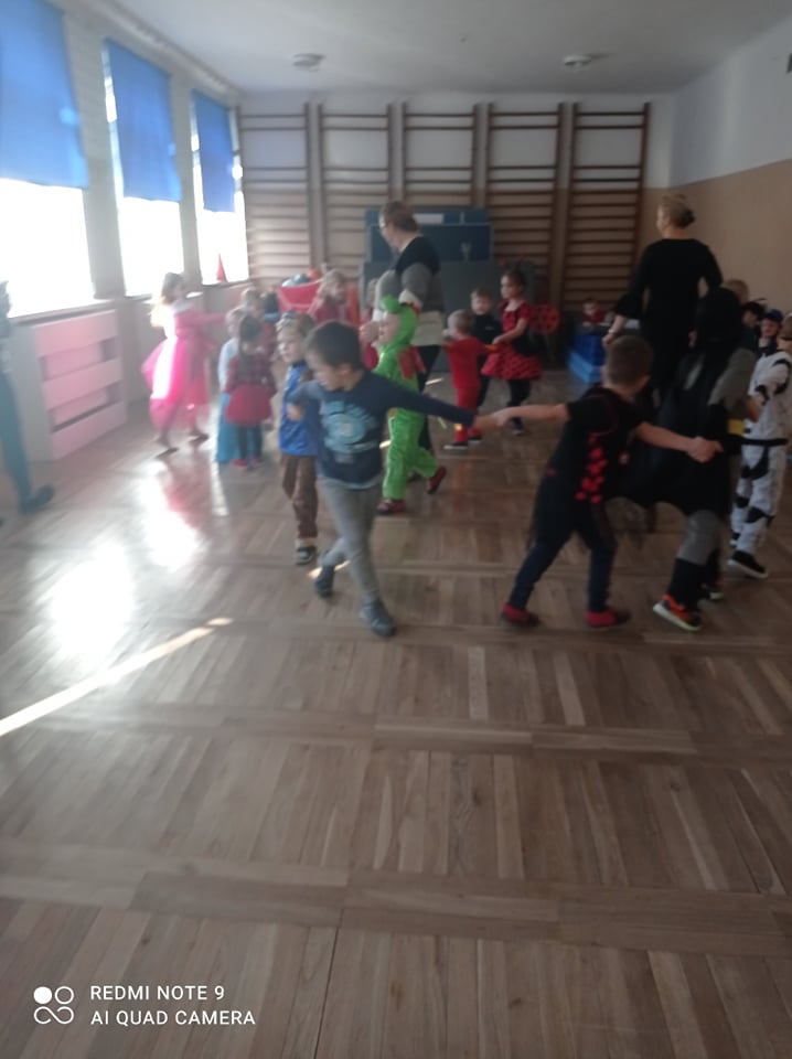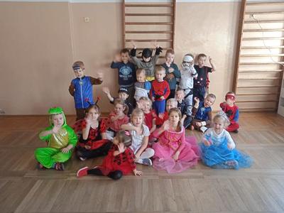 Tego dnia już od rana pojawiały się kolorowe postacie. Dzieci przebrane były za bohaterów znanych bajek, można było spotkać wróżki, królewny, biedronki, delikatne motylki, kotki, piratów, duchy, policjantów, Spider-Mana, Batmana itd. Nie sposób zliczyć i wymienić tych wszystkich postaci. Dzieci świetnie się bawiły i eksponowały swoje piękne stroje. Na sali podczas pląsów robiło się kolorowo, wszyscy bawili się wesoło, uśmiech nie znikał z twarzy mimo chwilowego zmęczenia.