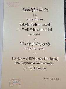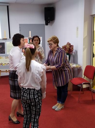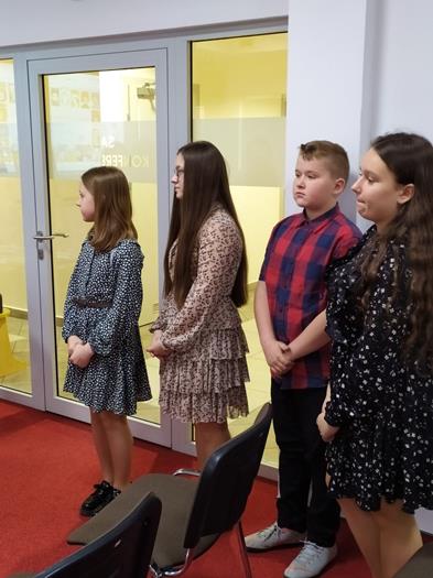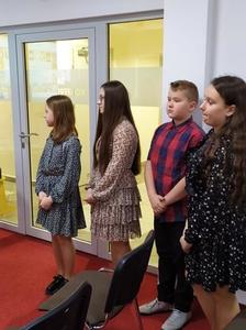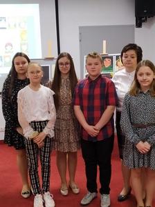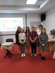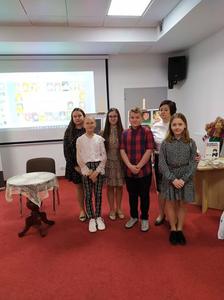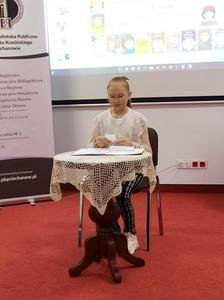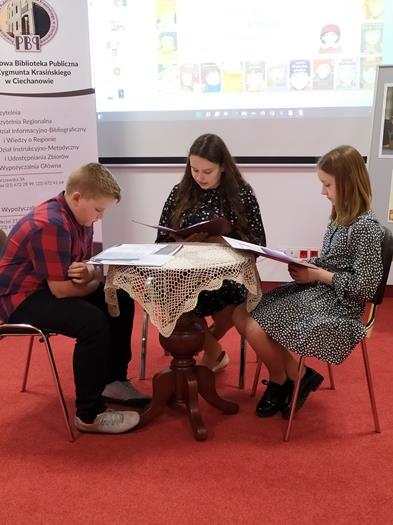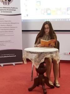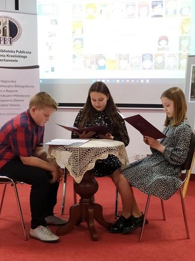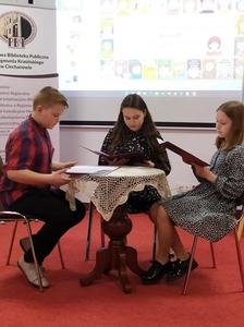 Izabela Rupińska - ucz. kl. VII , Magdalena Pszczółkowska - ucz. kl. V i Maciej Pokropski - ucz. kl. VI czytali z podziałem na role fragmenty książki ,,Opium w rosole. '' Zofia Przewodowska - ucz. kl. VIII przeczytała urywek pochodzący z książki M. Musierowicz ,,Szósta klepka'' a Oliwia Teklińska - ucz. kl. V zaprezentowała fragment z serii Jeżycjada ,,Kłamczucha.''