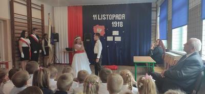 Maciej Gnas / kl. III/ rozpoczął uroczystość wykonując piosenkę „Co to jest niepodległość”. Razem z Leną Przewodowską / kl. III/ zaprezentowali się pięknym, reprezentacyjnym tańcem narodowym- polonez.