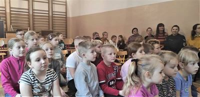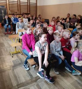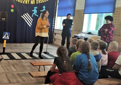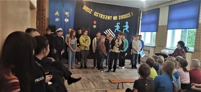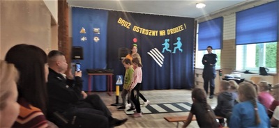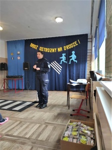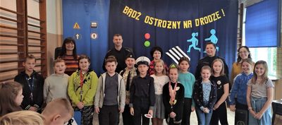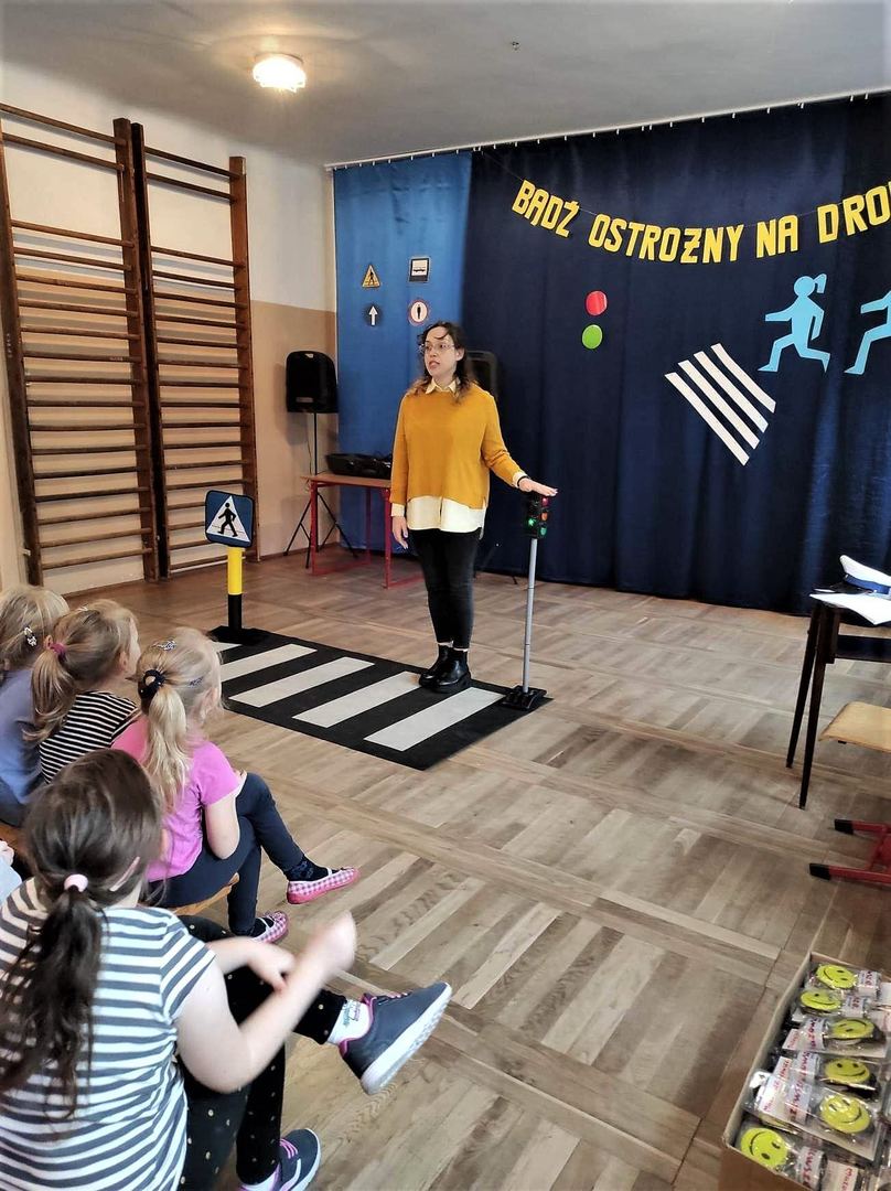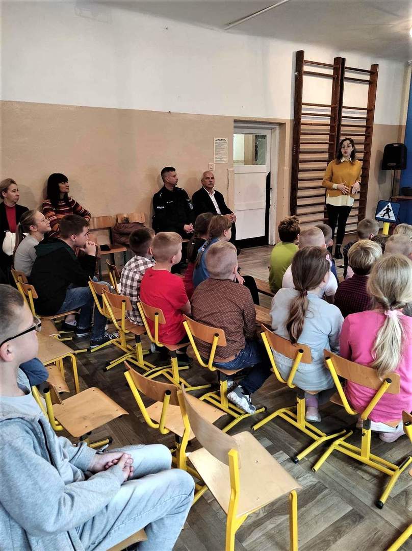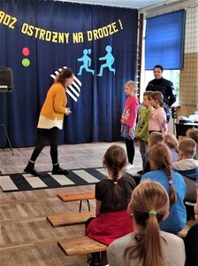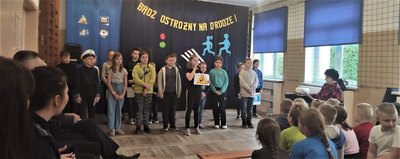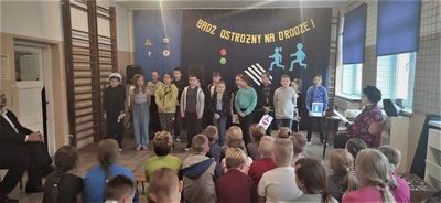 18.11.2022r. na sali gimnastycznej zaprezentowali oni młodszym koleżankom i kolegom z kl. 0 – III przedstawienie zatytułowane ,,Bądź bezpieczny na drodze”, przygotowane na zajęciach koła teatralnego. Zachęcali młodsze dzieci do właściwego i bezpiecznego zachowania na drodze, przestrzegali również przed urządzaniem zabaw w jej pobliżu, które mogą stanowić zagrożenie dla zdrowia i życia. Zaprezentowali najważniejsze znaki drogowe oraz podkreślili istotną rolę policjanta w zapewnianiu bezpieczeństwa w ruchu drogowym.