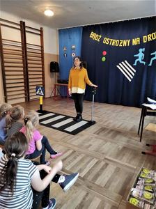 Po przedstawieniu, nagrodzonym gromkimi brawami przez widownię, odbyły się warsztaty przeprowadzone przez p. A. Szczygielską i p. M. Listkowską. Dzieci w praktyczny sposób uczyły się przechodzić przez przejście dla pieszych oraz powtórzyły i utrwaliły zdobytą dotychczas wiedzę na temat bezpiecznych zachowań w ruchu drogowym. Prowadzące były pod wrażeniem ogromnej aktywności i wiedzy dzieci w tym zakresie.