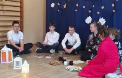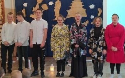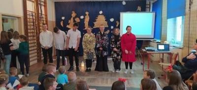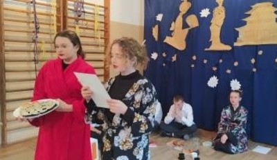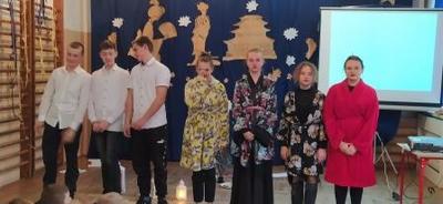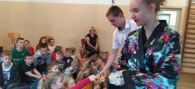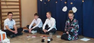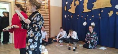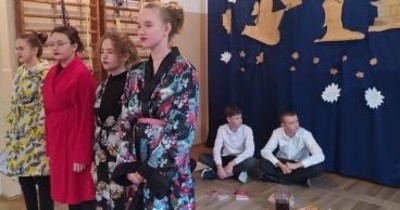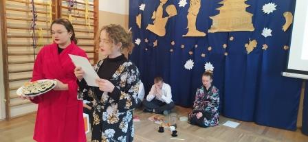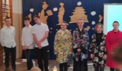 ,,Zróżnicowanie kultur – Azja”- to projekt edukacyjny, który zaprezentowali uczniowie klasy VIII. Przedstawili projekt koleżankom i kolegom z pozostałych klas. Wyświetlili szereg wiadomości o tym kontynencie. Omówili nie tylko położenie ale i warunki naturalne, gospodarkę, rolnictwo, kulturę i sztukę. Aby projekt był bardzo realistyczny, ubrani byli w kimona, które są częścią kultury azjatyckiej. Ponadto pokazali rytuał picia herbaty, omówili i zaprezentowali sushi – tradycyjną potrawę, częstowali ciasteczkami z wróżbą, pokazali jak pisze się znaki ,,kanji”, a także jak wyglądają książki japońskie – mangi. Na koniec rozdali małe upominki w postaci robionych samodzielnie wachlarzy. Projekt bardzo się wszystkim podobał, o czym świadczyły gromkie brawa.