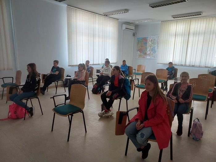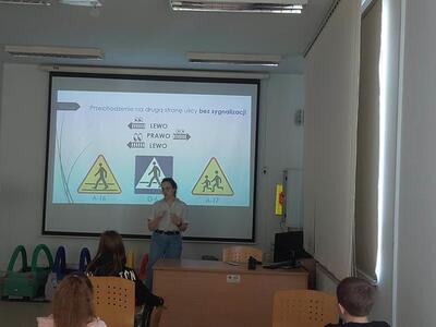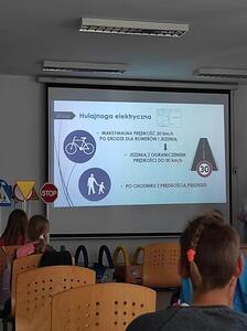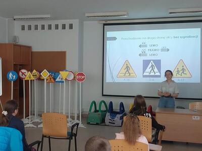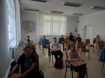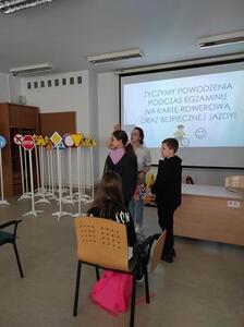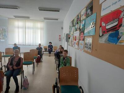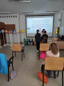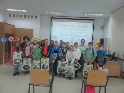 08.05.2023r. uczniowie kl. IV pod opieką p. E. Zbyszyńskiej i B. Blados udali się do WORDu w Ciechanowie. Dzięki uprzejmości Dyrektora WORDu p. Cezarego Chodkowskiego uczestniczyli w warsztatach, dotyczących bezpieczeństwa w ruchu drogowym. Były one kolejnym etapem przygotowania uczniów do zdania egzaminu na kartę rowerową. Warsztaty połączone z prezentacją multimedialną w bardzo ciekawy sposób przedstawiła p. inspektor Aleksandra Szczygielska. Na koniec spotkania uczniowie otrzymali zestawy rowerowe (kask, kamizelkę odblaskową, światła rowerowe). Uczniowie na ręce p. inspektor złożyli również własnoręcznie wykonane podziękowanie.
