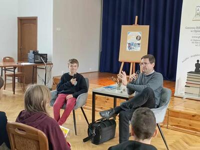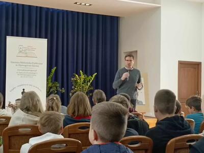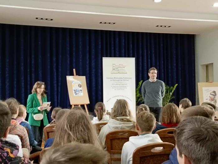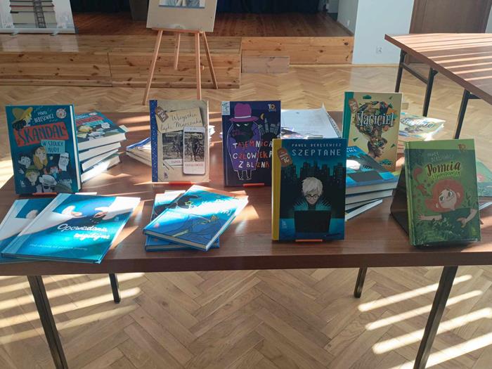 Następnie w sali konferencyjnej Urzędu Gminy w Opinogórze Górnej odbyło się spotkanie autorskie z Pawłem Beręsewiczem. Pisarz mówił o sobie i bohaterach swoich niezwykłych książek. Uczniowie aktywnie uczestniczyli w spotkaniu, dzielili się swoimi spostrzeżeniami i zadawali ciekawe pytania . Mieli możliwość zakupu książek i otrzymania autografu z osobista dedykacją.