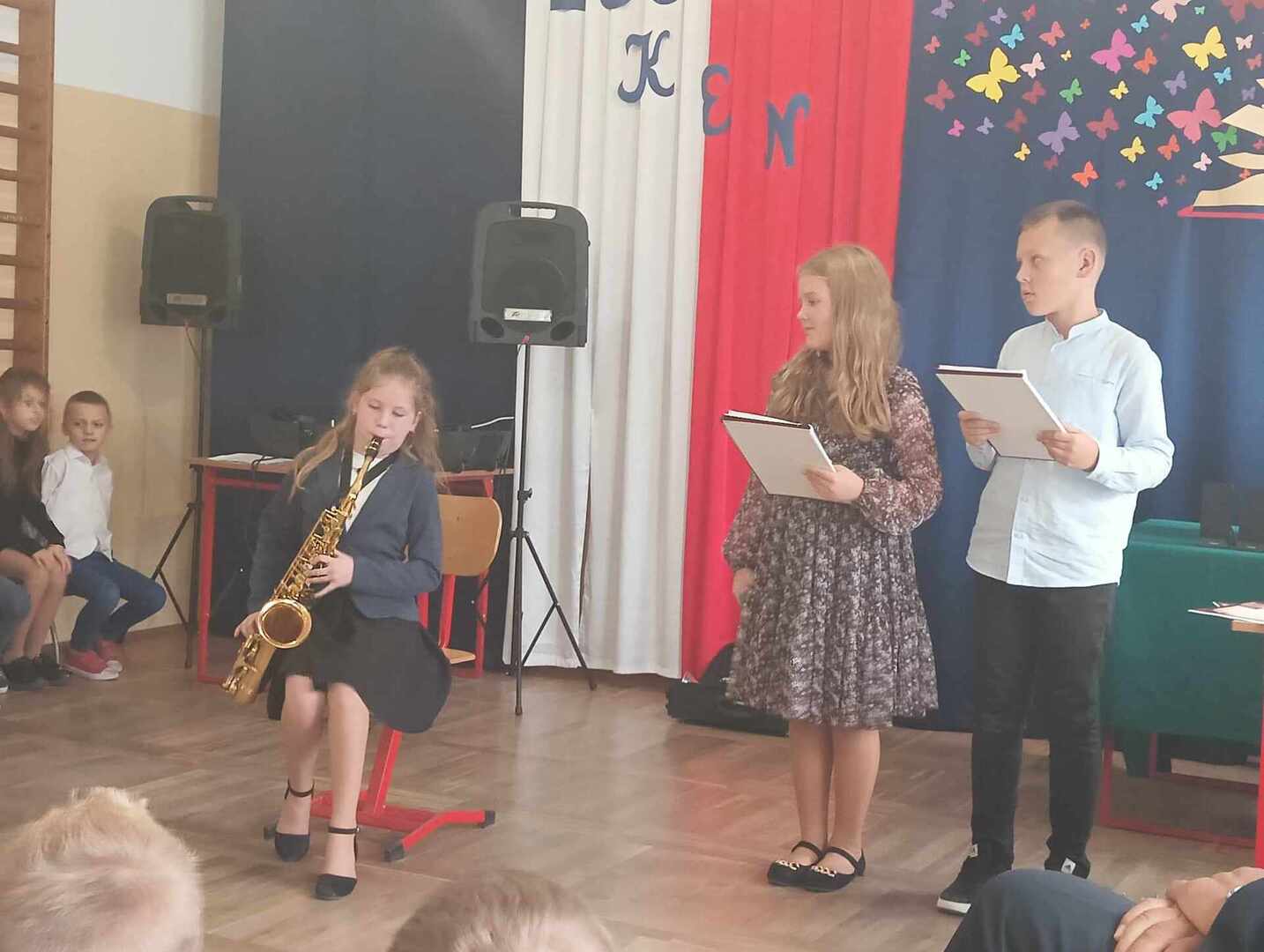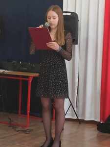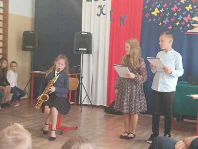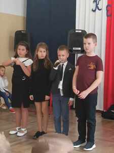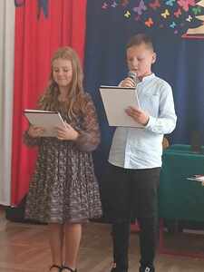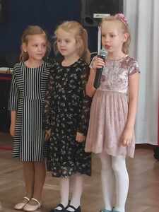 Następnie rozpoczęła się część artystyczna, która przygotowana była przez uczniów z kilku klas (przedszkole, 1,3,4,5,6,7) pod opieką pani Marty Pokropskiej oraz Barbary Goździewskiej. Uczniowie klasy 8 wręczyli nauczycielom i pracownikom szkoły skromne upominki w postaci kwiatków.