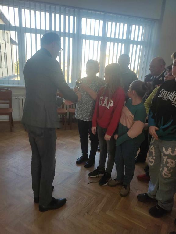 Uczniowie pisali test dla grupy wiekowej – klasy V – VIII,składający się z 30 pytań zamkniętych i 20 pytań otwartych. Test okazał się być bardzo trudny dla naszych uczniów, w wyniku czego grupowo zajęliśmy trzecie miejsce. Wszyscy uczestnicy otrzymali pamiątkowe statuetki i kalendarze strażackie a szkoła puchar, który z rąk Pana Piotra Czyżyka Wójta Gminy Opinogóra Górna odebrała Pani Izabella Łączyńska.