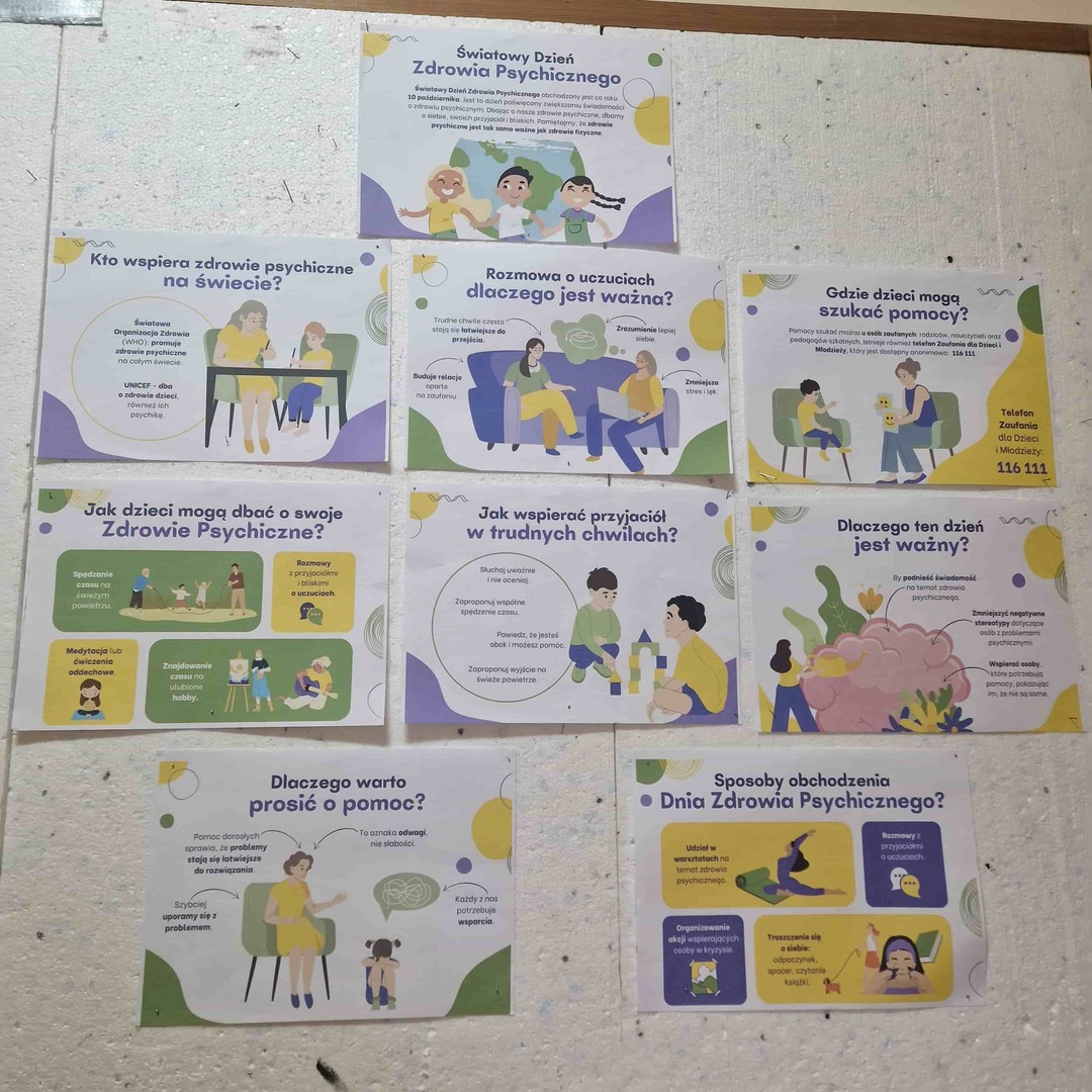 W naszej szkole Światowy Dzień Zdrowia Psychicznego odbył się 9.10. Pani psycholog przeprowadziła w klasach zajęcia psychoedukacyjne , na których rozmawiano o sposobach radzenia sobie ze stresem i trudnymi emocjami, znaczeniu odpoczynku i relaksu w dniu codziennym oraz bardzo ważnej roli wsparcia rówieśniczego i pozytywnej relacji . Na korytarzu szkolnym dostępna była gazetka dotycząca Światowego Dnia Zdrowia Psychicznego .Uczniowie kl.4-8 otrzymali ulotki informacyjno-profilaktyczne. W oddziale przedszkolnym odbyły się zajęcia oparte na bajce terapeutycznej ,, Łatki żyrafy Klementynki”. W tym dniu zorganizowano ogólnoszkolną akcję pt. ,, Weź ze sobą dobre słowo i podaj dalej”, która miała na celu kształtowanie postawy wdzięczności i budowaniu dobrych relacji wśród uczniów naszej szkoły . Akcja spotkała się z ogromnym entuzjazmem wśród dzieciaków , co można było obserwować podczas przerw.