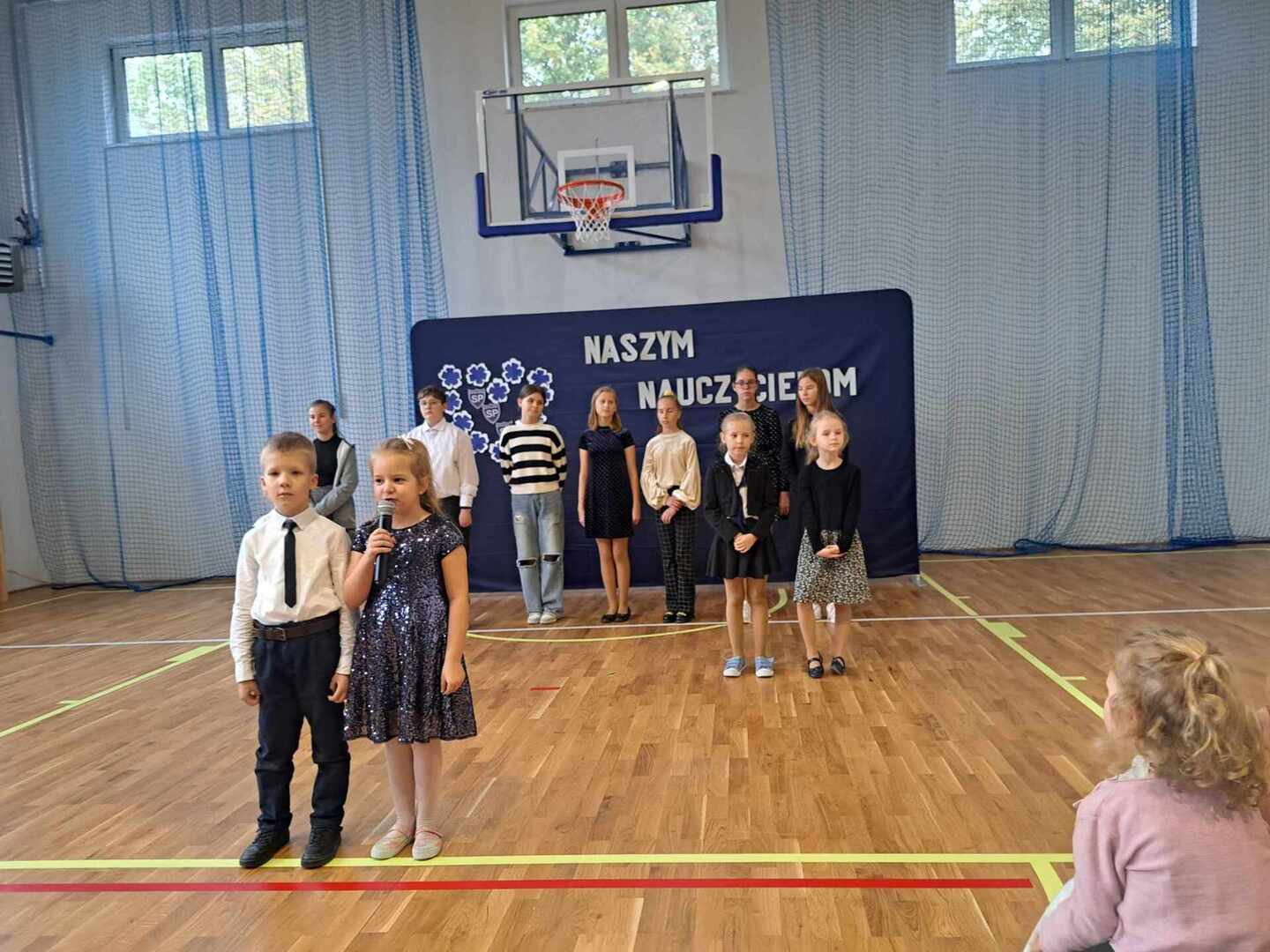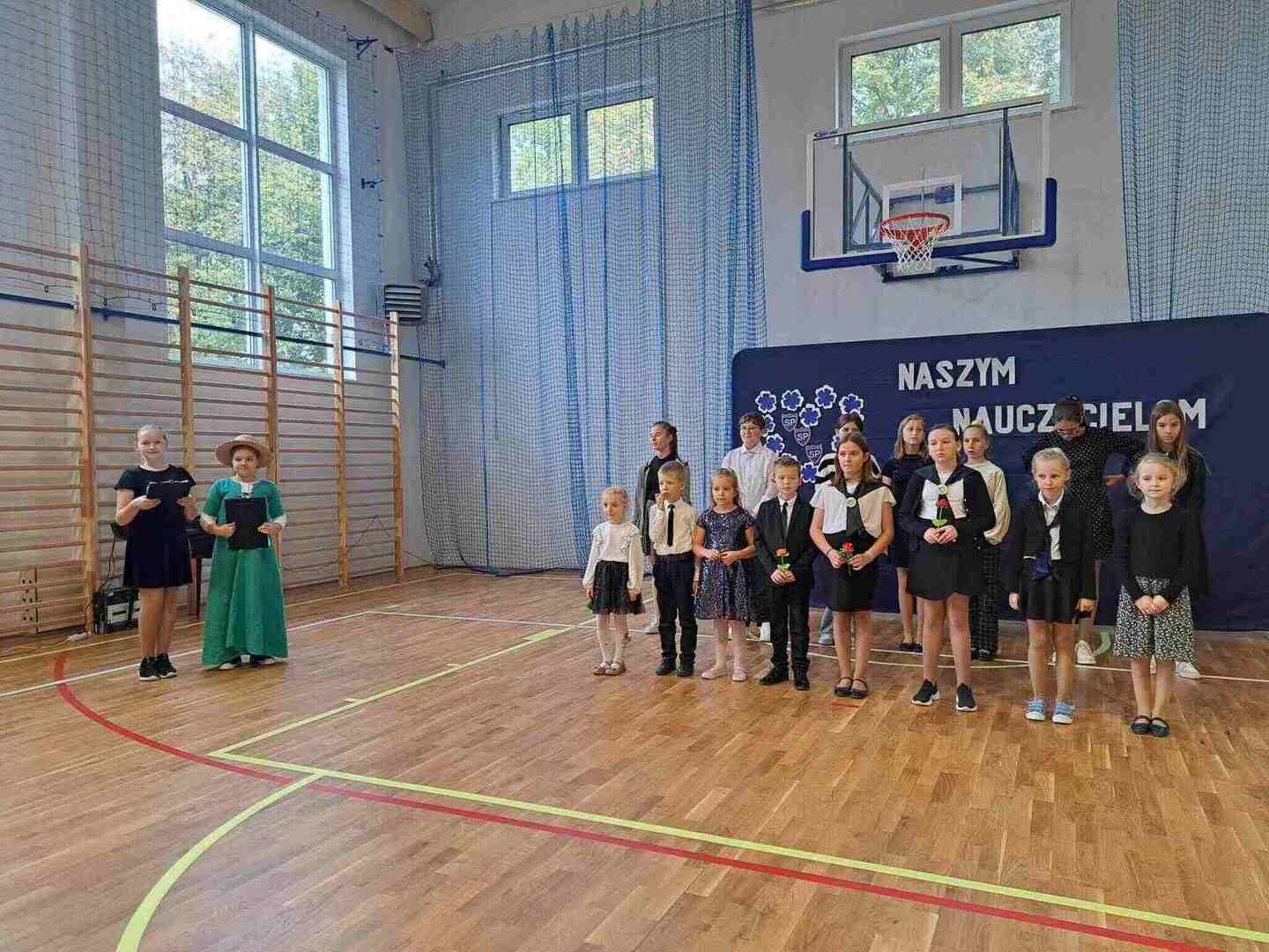 15 października 2024 w naszej szkole obchodziliśmy Dzień Edukacji Narodowej. Jest to święto nauczycieli, wychowawców, pedagogów oraz pracowników administracji. Obchodzony jest w rocznicę powołania w 1773 r. Komisji Edukacji Narodowej – pierwszego w Europie ministerstwa oświaty – która zajęła się reformowaniem szkolnictwa w Polsce. Z tej okazji uczniowie naszej szkoły przyszli odświętnie ubrani. Pani Ewa Zbyszyńska przygotowała akademię z uczniami klasy 1, 2, 3 i 6. Tego dnia Pani Dyrektor Marta Pokropska wręczyła nagrody Dyrektora Pani Annie Redwanowskiej, Pani Barbarze Goździewskiej, oraz Panu Tomaszowi Gapkowskiemu. Uczniom, którzy uzyskali w II półroczu roku szkolnego 2023/2024 średnią ocen 5,33 i wyżej pani Dyrektor wręczyła stypendia.