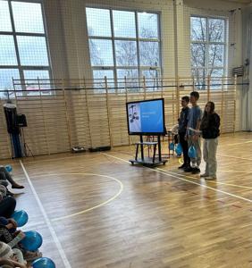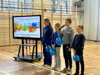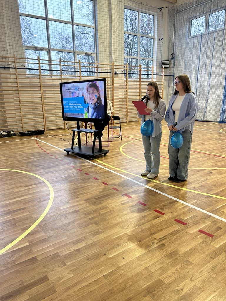 Następnie wszyscy uczniowie naszej szkoły, wyposażani w niebieskie balony, zgromadzili się na hali sportowej, gdzie odbył się apel z okazji Międzynarodowego Dnia Praw Dziecka. Została wyświetlona prezentacja, z której cała społeczność szkolna mogła dowiedzieć się jaka historia jest związana z obchodami tego dnia, jakie dokumenty zawierają spis praw dziecka oraz poznać treść owych praw. Istotną informacją było to, że Polska odegrała szczególną rolę w tworzeniu światowego systemu ochrony praw najmłodszych- była inicjatorem uchwalenia Konwencji o prawach dziecka. Poinformowano uczniów również o tym, w jakich sytuacjach mogą liczyć na pomoc oraz gdzie się udać, by ją otrzymać. W drugiej części spotkania uczniowie recytowali wierszyki oraz wspólnie ze wszystkimi zebranymi na hali, odśpiewali piosenkę o prawach ucznia.