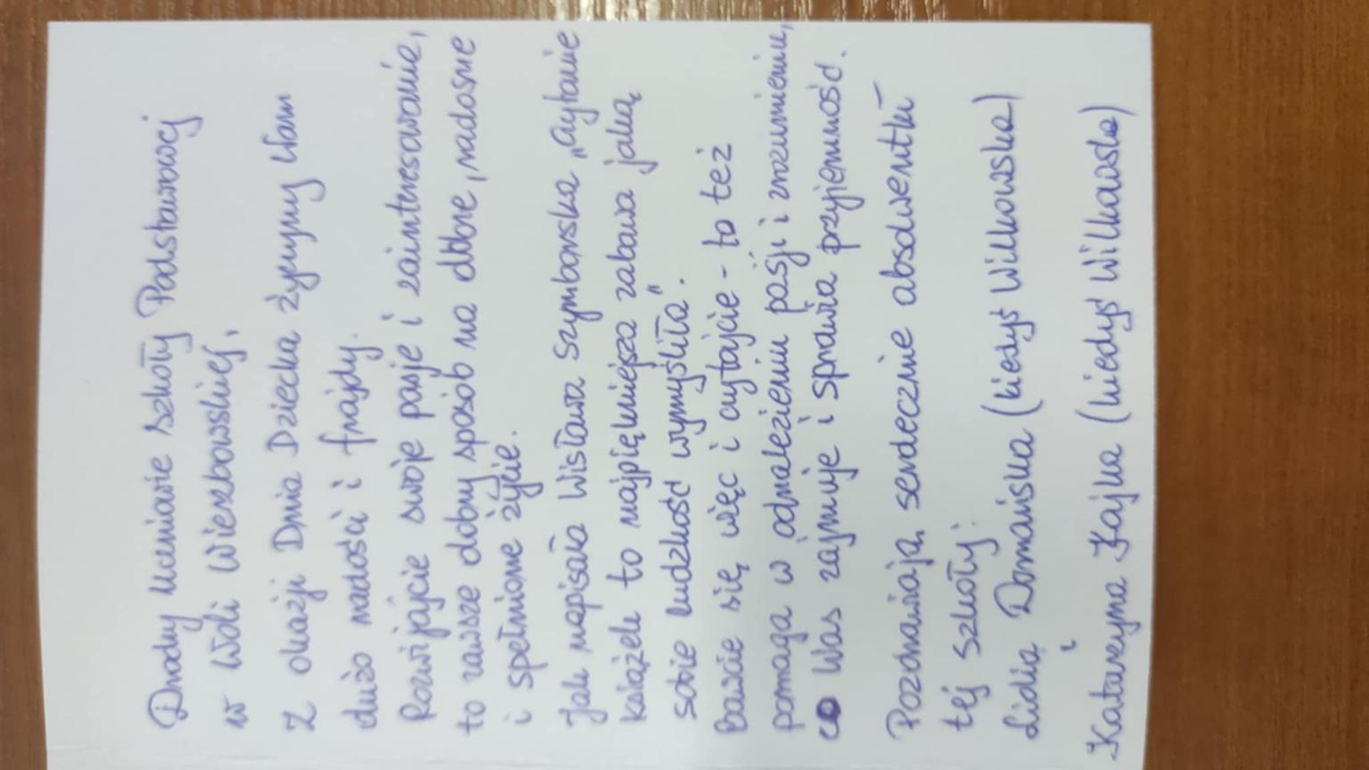 29 maja do naszej szkoły dostarczono wyjątkową przesyłkę. Znajdowało się w niej 61 książek dla dzieci i młodzieży, jako dar do biblioteki szkolnej oraz niezwykłe życzenia od p. Lidii Domańskiej z domu Wilkowskiej i jej siostry, Katarzyny Kajki . Obie panie są absolwentkami naszej szkoły. Obecnie pracują w Wydawnictwie ,,BIS”.