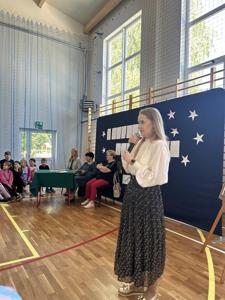 Finałem spotkania było wystąpienie uczennic z klas: VI-VIII, które zaprezentowały wybrane wiersze autorki przed całą społecznością szkolną. Dbałość o dykcję, intonację i tempo wypowiedzi uczyniła ich wystąpienia wyjątkowo wartościowymi i artystycznie dopracowanymi. Następnie przemówiła p. Anna Redwanowska, a uczennice z klasy V wręczyły zaproszonym gościom symboliczne upominki- wyraz podziękowania za inspirującą obecność.