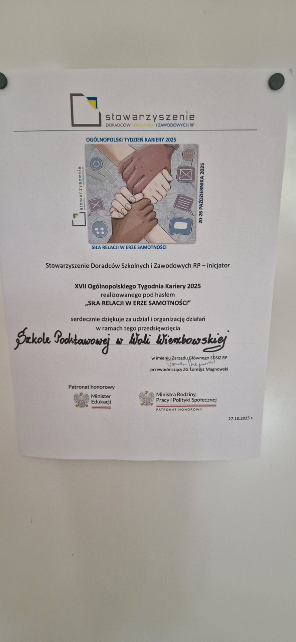 W ramach Ogólnopolskiego Tygodnia Kariery 2025, organizowanego z inicjatywy Stowarzyszenia Doradców Szkolnych i Zawodowych RP, nasza szkoła włączyła się w działania pod hasłem „Siła relacji w erze samotności”.