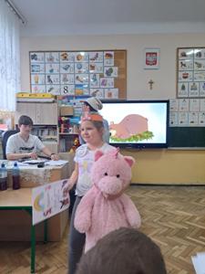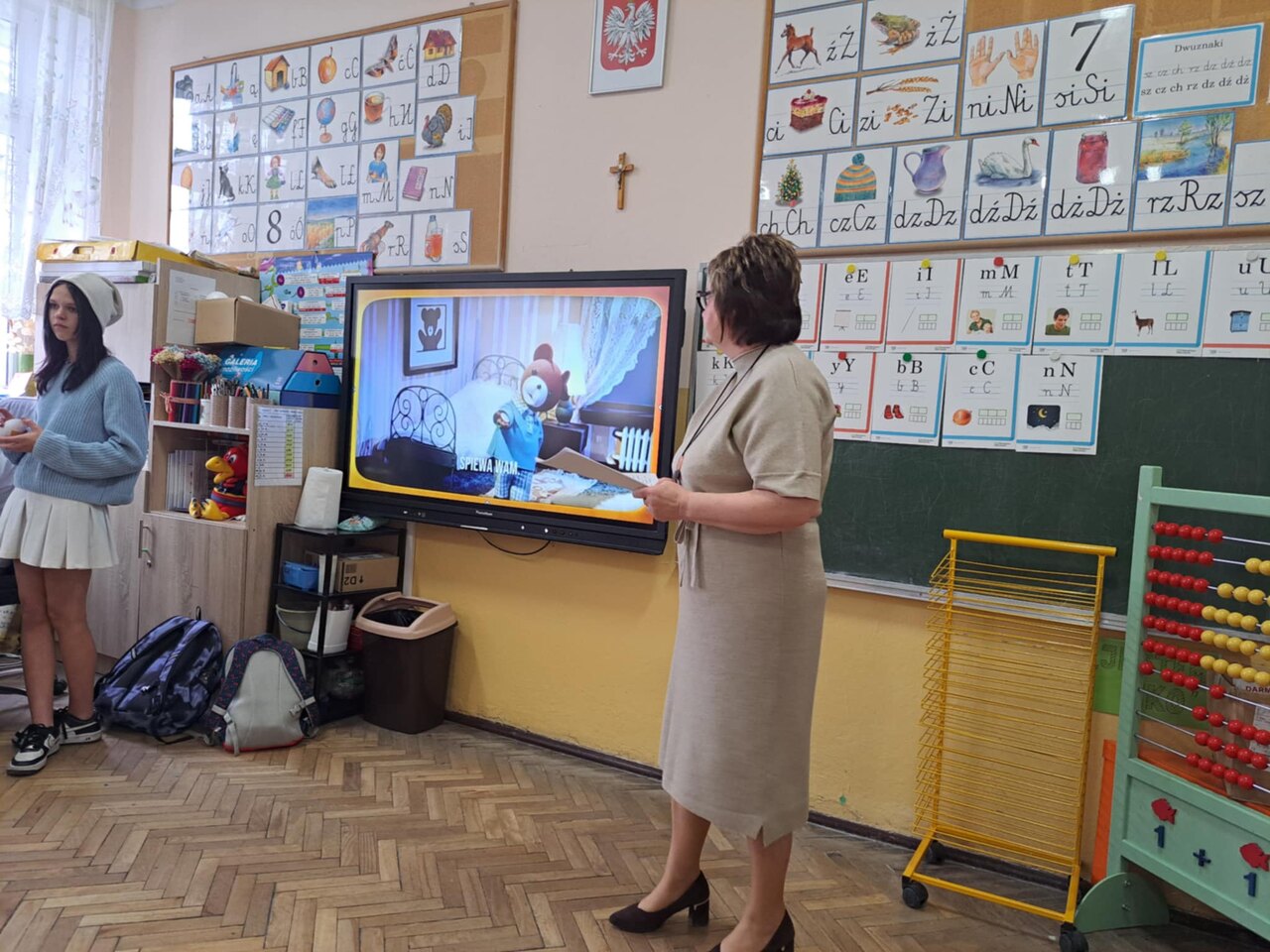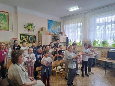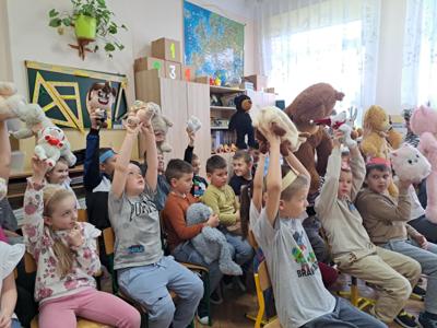 Już od rana wraz z dziećmi pojawiły się misie małe, średnie, duże i bardzo duże. Po krótkim powitaniu przez P. Annę Redwanowską i przedstawieniu historii powstania pluszowego misia uczniowie wysłuchali piosenki ,,Miś Uszatek'' i wskazywali charakterystyczne cechy swojego wiernego przyjaciela.