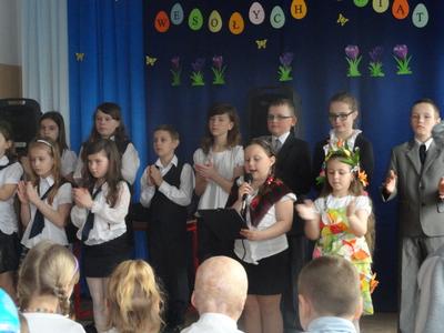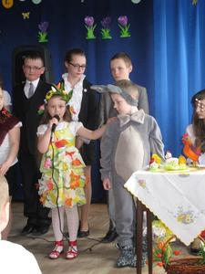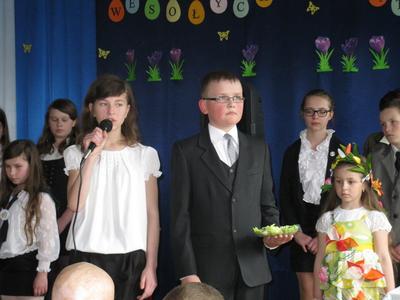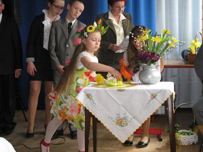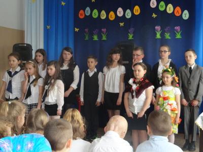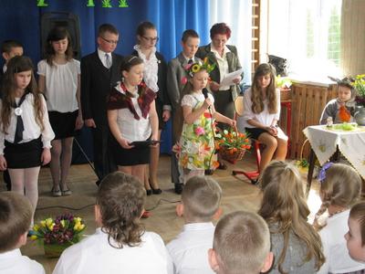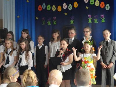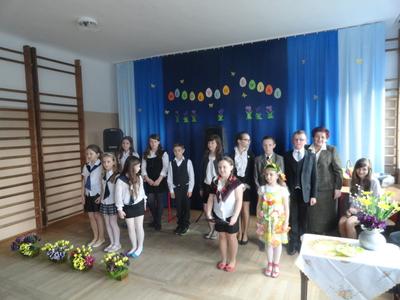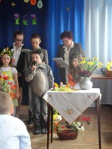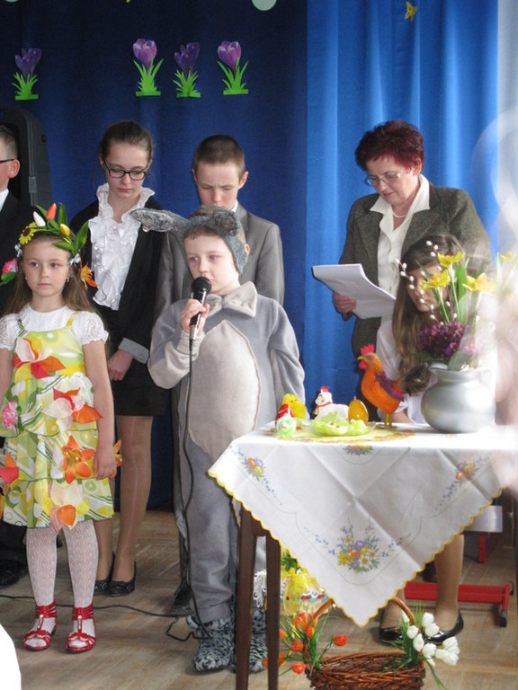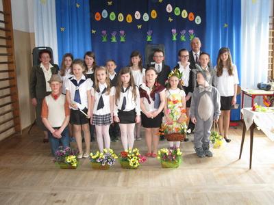 Na zakończenie p. Izabella Łączyńska poinformowała społeczność szkolną o sukcesach uczniów w gminnym konkursie pod hasłem;"Pocztówka, pisanka i baranek wielkanocny". Wspólnie z p.dyrektorem wręczyła nagrody uczestnikom konkursu.