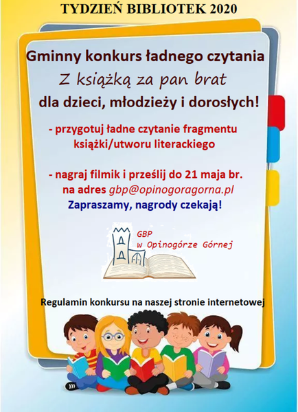 06.05.2020 Aktualności Gminny konkurs ładnego czytania W ramach akcji Tydzień Bibliotek 2020 GBP w Opinogórze Górnej organizuje konkurs czytelniczy dla dzieci, młodzieży i dorosłych. Żeby wziąć w nim udział, należy... Czytaj więcej